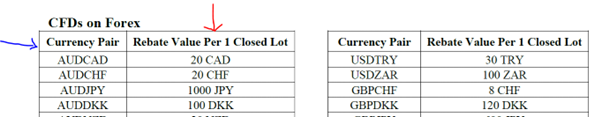 青い矢印が指しているCurrency Pairは紹介顧客が取引をした通貨ペア、赤い矢印が指しているRebate Value Per 1 Closed Lotは往復取引1ロットあたりの報酬額を意味します。