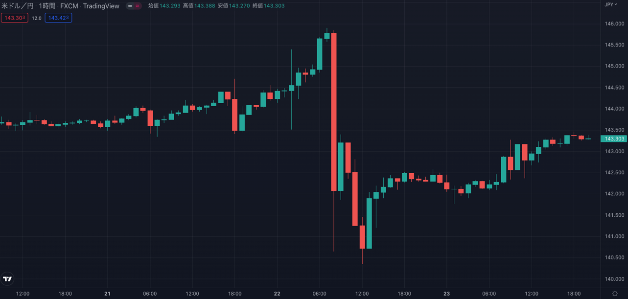 例えば、以下のチャートは、2022年9月22日のドル円の1時間足です。