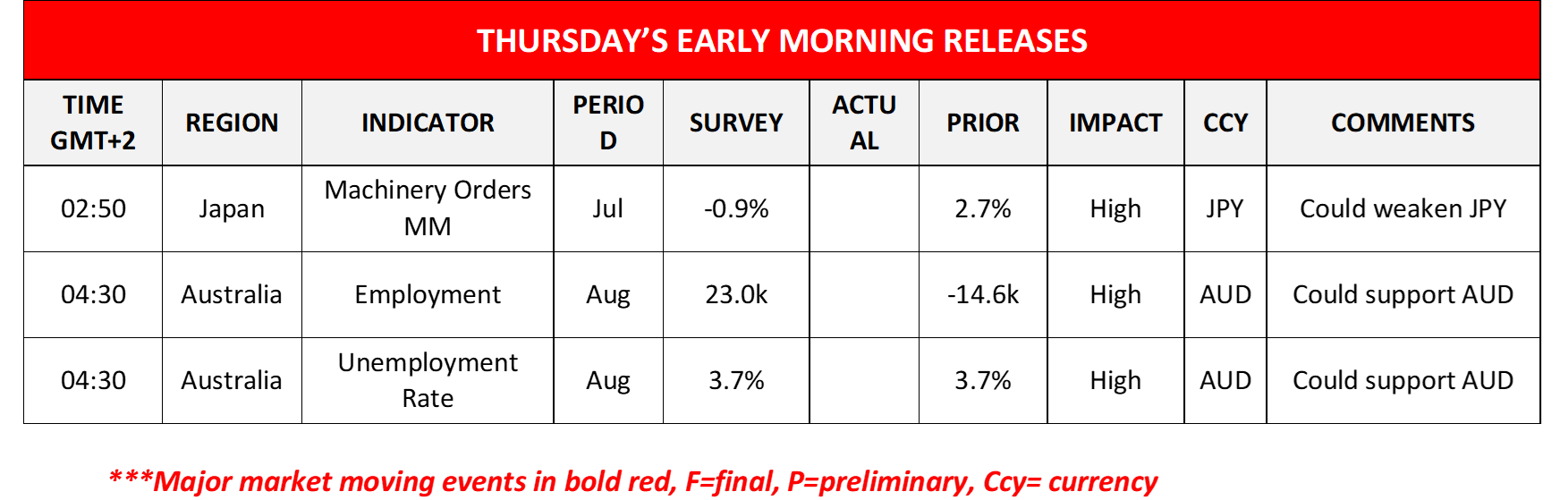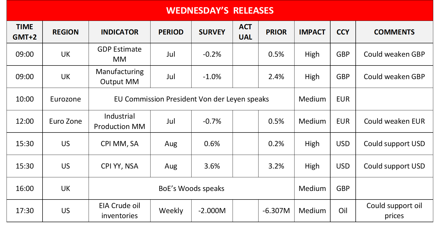 In today’s European session we note the release of UK’s GDP and manufacturing growth rates for July and Eurozone’s industrial output growth rate for the same month. Please note that EU Commission President Von der Leyen speaks. In the American session, we highlight the release of the US CPI rates for August, while oil traders may be more interested in the release of the US weekly EIA crude oil inventories figure, while on the monetary front BoE’s Woods speaks. During tomorrow’s Asian session we get Japan’s machinery orders for July and highlight Australia’s August employment data