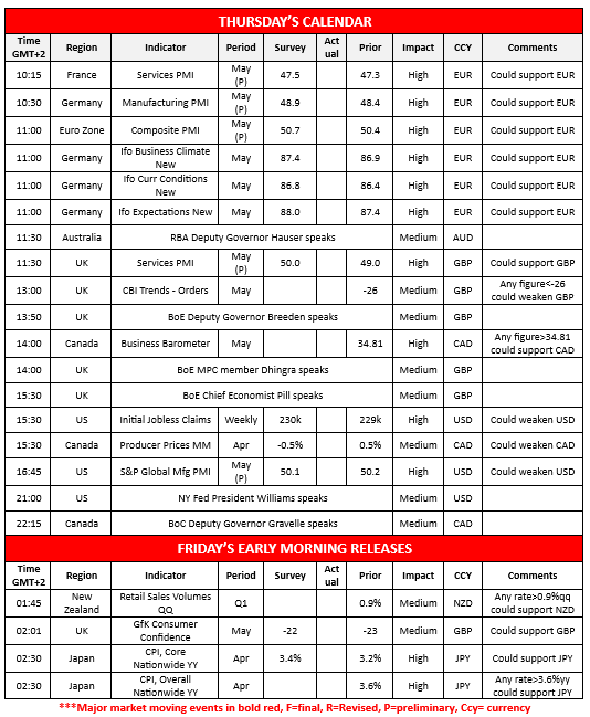 Today we get the preliminary PMI figures of May for the UK and the US, while we also note the release of Germany’s Ifo indicators for May, UK’s CBI industrial orders also for May, the US weekly initial jobless claims figure, Canada’s business barometer for May and PPI rates for April, as well as the US S&P global manufacturing PMI figure for May. On a monetary level, we note the planned speeches of RBA Deputy Governor Hauser, BoE Deputy Governor Breeden, BoE MPC member Dhingra, BoE Chief Economist Pill, NY Fed President Williams and BoC Deputy Governor Gravelle. In tomorrow’s Asian session, we get and Japan’s inflation metrics for April.