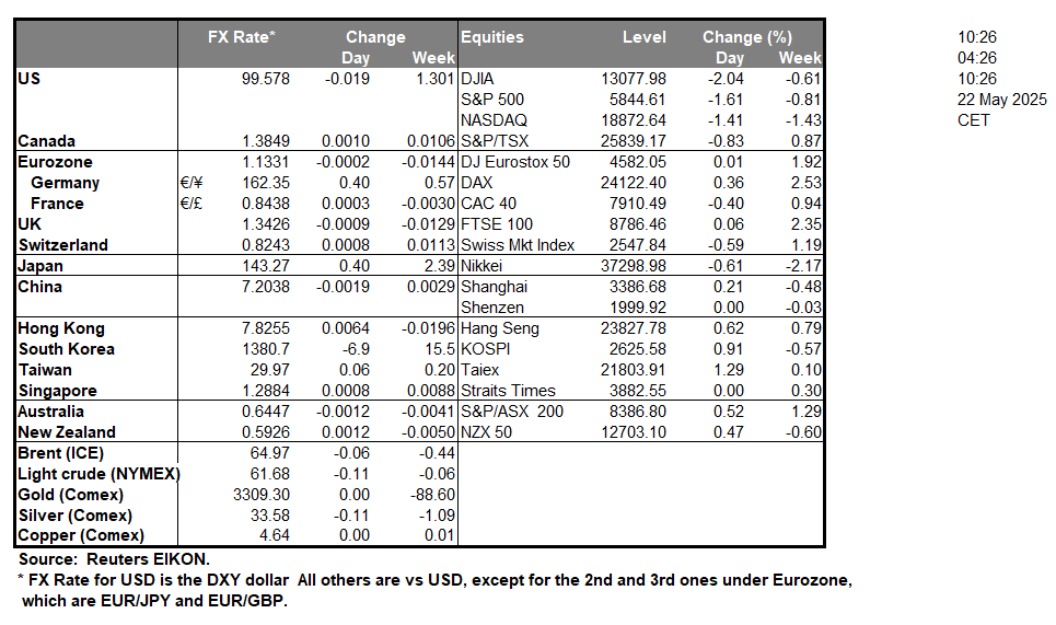 The USD weakened, while we had also a sharp correction lower of US stock markets yesterday, as all three major US equities indexes dropped uniformly. Market worries for the US economic outlook intensified driving the markets, as US President Trump’s new tax and spending bill seems to be passing a critical hurdle at the US Congress. Overall, the issue is expected to widen any budget deficit thus increasing the US national debt, which in turn has to be served with high interest costs. At the same time, there was low demand for the US 20-year bond yesterday, indicative of the situation, causing the relative US treasury yield to rise substantially while gold’s price benefited from safe-haven inflows. Finally we note that bitcoin’s price has reached new all time highs, yet that may also be related to new US crypto legislation which tends to find bipartisan support. Should we see market worries intensifying further we may see the market moves being enhanced as investors may turn to alternatives to US assets.