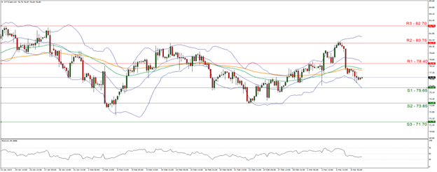WTI has been in a downwards motion since the 7th of March following Fed Chair Powell’s hawkish testimony before the Senate. As a result, the bears were able to control the commodity’s price and sent it below the resistance of $78.40 previous support level now turned resistance (R1). We hold a bearish outlook for the commodity and supporting our case, is the RSI indicator which is holding below 50 reading and moves closer to the 30 oversold level. Furthermore, we note the widening of the Bollinger bands following Powell’s comments and more specifically the price tends to flirt with the lower bound of the band, which adds more confidence to our bearish assessment. Also, the break below the 50 and 100 period Moving Averages constitutes as another bearish signal. If bears remain in control, we may see the break below 75.65 (S1) support and should the push lower persists, we may see the test of the 73.85(S2) support base. If the bulls take over, we may see the break above the 78.40 (R1) resistance level and if they are able to break through, then we may see the bulls retesting the 80.75 (R2) resistance barrier, which serves as the closest ceiling.