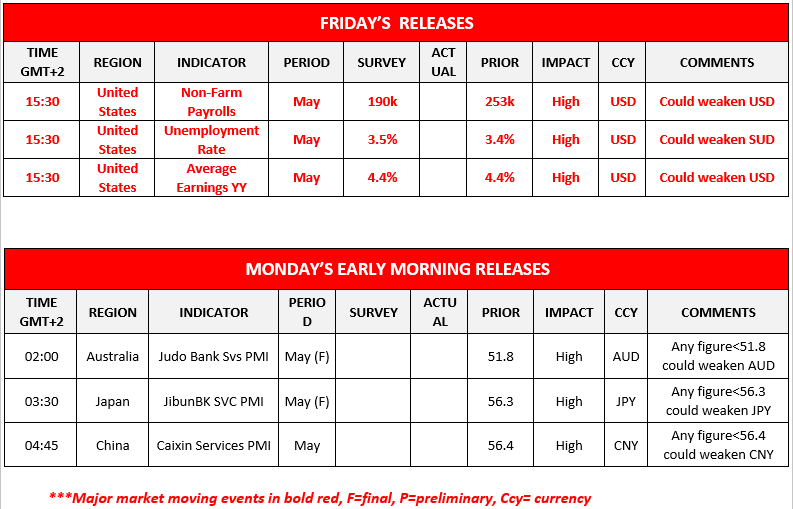 Besides today’s US employment report for May we expect no major financial releases for the day. During Monday’s Asian session, we note the final services PMI figures of Japan and Australia as well as the Caixin services PMI figure all being for May. Oil traders on the other hand may be more interested in the OPEC+ meeting over the weekend.