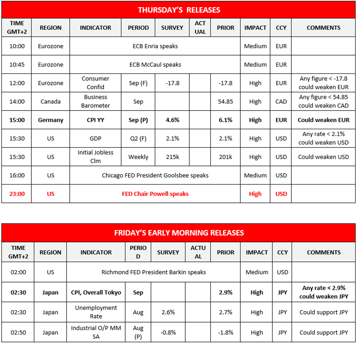 In today’s European session, we note the Eurozone’s final consumer confidence figure for September, followed by Canada’s business barometer figure for September, Germany’s preliminary CPI rates for September, the US final GDP rates for Q2, the weekly initial jobless claims figure. In tomorrow’s Asian session, we note Japan’s Tokyo CPI rates for September, unemployment rate for August and their preliminary industrial output for August. Lastly on a monetary note, we highlight the speeches by ECB Enria and McCaul during today’s European session and later on during the American session, the speeches by Chicago Fed President Goolsbee and Fed Chair Powell. In tomorrow’s Asian session, we note Richmond Fed President Barkin is due to speak.