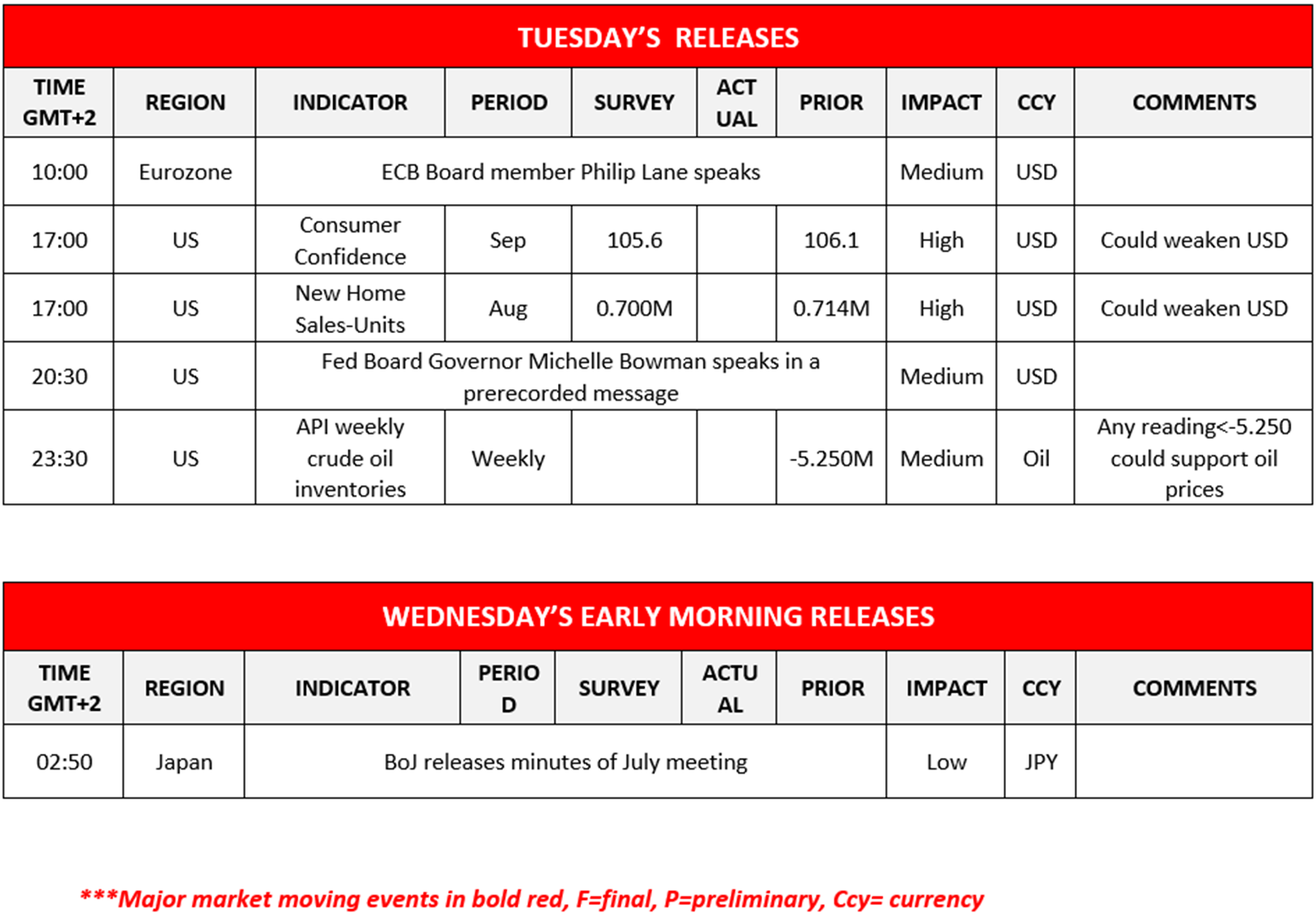 In today’s European session, we note that ECB Board member Philip Lane is scheduled to speak. In the American session, we note that we get from the US September’s consumer confidence and August’s number of new home sales while just before the Asian session starts oil traders may be more interested in the release of the API weekly crude oil inventories figure. Please note that during tomorrow’s Asian session, BoJ is to release the minutes of the July meeting.