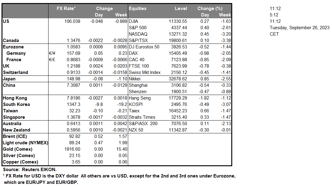 The US Government is facing a potential shutdown, as early as October 1st and with the deadline quickly approaching, we note that no major developments have been made by the House of Representatives in order to avoid a potential shutdown. In the event of a shutdown, we may see the greenback weakening, as the implications of a government shutdown, could greatly impact the US economy. Minneapolis Fed President Kashkari re-iterated his views yesterday, that the Fed may need to hike once more should the economy show signs that the economy is stronger than what is anticipated. Furthermore, he stated that market participants are anticipating one more hike by the Fed this year and as such may be inferring that another hike is still a possibility, potentially providing support for the dollar. Over in Europe, ECB President Lagarde stated yesterday that “ rates have reached levels that, maintained for a sufficiently long duration, will make a substantial contribution to the timely return of inflation to our target.”, implying that the ECB may have reached its peak terminal rate, yet they may have to stay at their current levels for a prolonged period of time, which may support the EUR should the ECB’s counterparts ease on their monetary policy earlier than the bank. Over in Asia, USD/JPY reached $149, reaching levels last seen in September 2022, which may be reaching levels upon which the Japanese Government had previously intervened and as such, should the government step in to safeguard the Yen, we may see the USD/JPY pair moving to lower ground. Over in the commodities market, sugar futures have eased from 12-year highs, over the past week or so, however, fundamentally speaking the divergence between supply and demand forces are expected to push the commodities price to higher ground, more specifically India who is one of the largest sugarcane producers is experiencing droughts and the Indian Government ponders limiting exports.