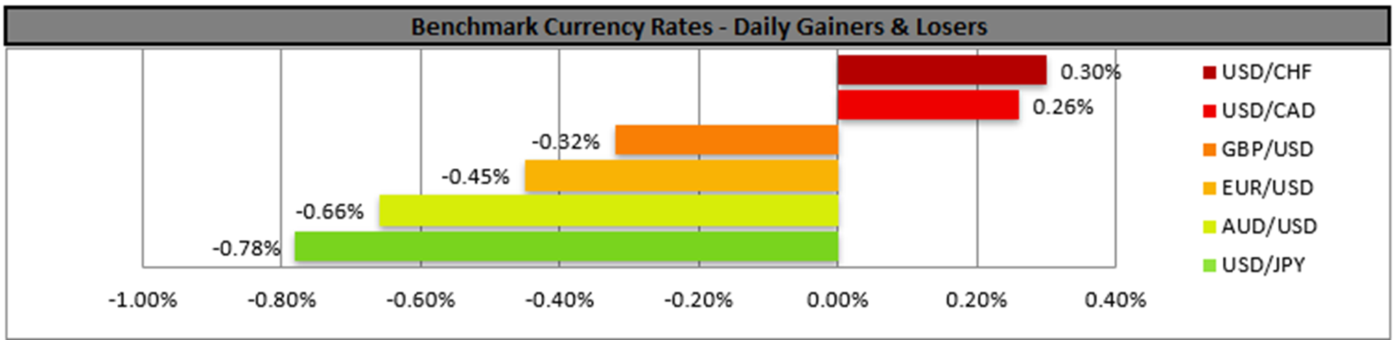 EUR/USD continued to weaken yesterday and decisively broke the 1.0890 (R1) support line, now turned to resistance. We note that the RSI indicator dropped reaching the reading of 50 and implying that the bullish sentiment among market participants has been erased, yet bearish tendencies have still to be build up. Nevertheless, given the intensity of yesterday’s movement we expect the bearish direction to be maintained for now and over the short term. Should the bears maintain control over the pair we expect the pair to aim if not reach the 1.0740 (S1) support line. Should the bulls take over, we may see the pair reversing direction, breaking the 1.0890 (R1) resistance line and aim for the 1.1010 (R2) resistance level.