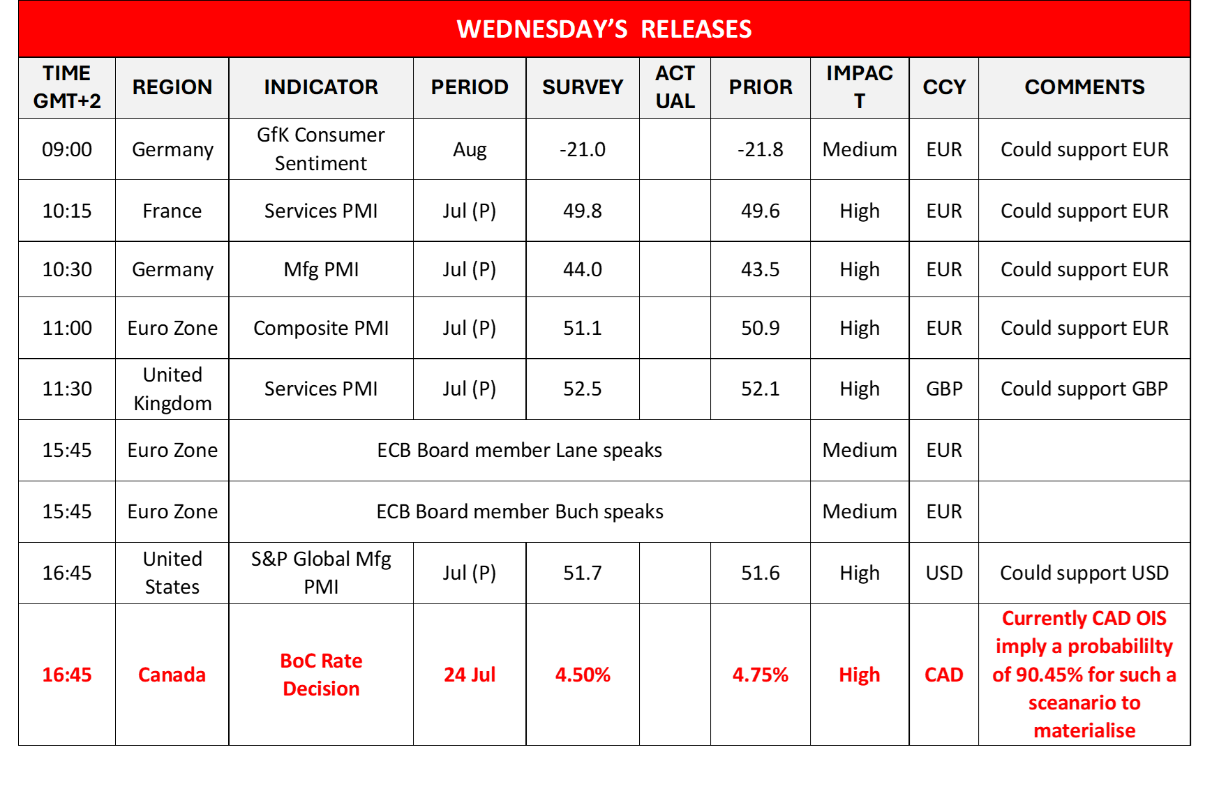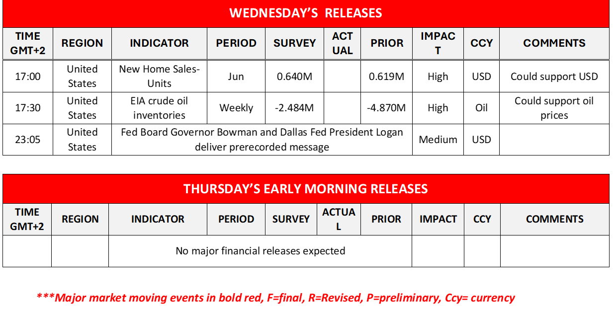 Today, besides the preliminary PMI figures of the UK for July, we note the release of Germany’s GFK consumer sentiment for August, the US new home sales for June and the weekly EIA crude oil inventories figure. On the monetary front, ECB Board member Lane and Buch are scheduled to speak.