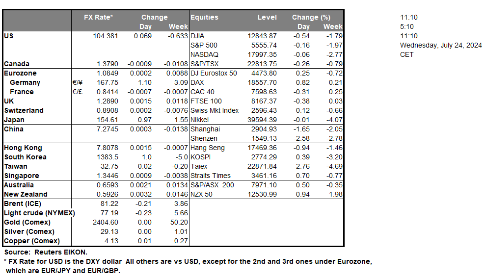 The USD continued to edge higher against its counterparts yesterday yet seems to be correcting a bit lower during today’s Asian session. On a fundamental level, the spotlight remains on Kamala Harris, while on a macroeconomic level, we note that the existing home sales for June dropped more than expected, while we also get some US construction data today as well. Yet the headlight is expected to be placed on the US preliminary PMI figures for July in an effort to gauge economic activity and the market’s worries tend to revolve around the manufacturing sector.
