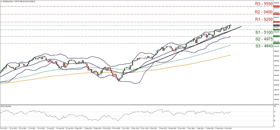 S&P 500 continued to rise since our last report placing some distance between the index’s price action and the 5100 (S1) support line, which by the way provided support for the price action. We tend to maintain our bullish outlook as the upward trendline guiding the index since late October last year, remains intact and continues to support the upward movement. At the same time, we note that the RSI indicator remains just below the reading of 70, implying that the bullish sentiment in the market for the index remains present. Also, the 20 moving average (MA), the median of the Bollinger bands, the 100 MA (green line) and the 200 MA (Orange line) are all pointing upwards highlighting the upward trajectory of the index. On the other hand, the price action is flirting with the upper Bollinger band, which in turn may slow down the bulls somewhat. Furthermore, please note that the index remains near record-high levels and is about to enter uncharted waters once again, which may cause the bulls to hesitate. Should buyers maintain control over the index, we set the next target for the bulls at the 5250 (R1) resistance line while even higher we note the 5400 (R2) resistance line. On the flip side should the bears find a chance and take over, we may see the index dropping, breaking the prementioned upward trendline in a first signal that the upward movement has been interrupted, breaking the 5100 (S1) support line that was a prior record high level yet turned into support as the price action moved above it. Next possible target for the bears should the S1 be broken, could be the 4975 (S2) support base.