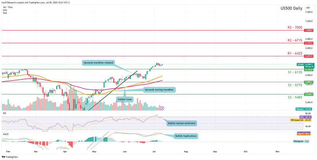 There has been a slight decline on behalf of US stock markets since the start of the week, with the S&P500 retreating slightly from it’s newly formed all time high. In today’s report, we are to have a look at the upcoming release of the FOMC’s meeting minutes, the ongoing tariff narrative, Elon’s America Party and lastly a small note about upcoming earnings reports. The report is to be concluded with a technical analysis of S&P 500’s daily chart.