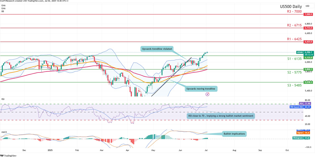 The US Employment data for June is set to be released on Thursday. The Non-Farm Payrolls figure is expected to come in at 120k which would be lower than last months figure of 139k. Moreover, the unemployment rate is expected to increase from 4.2% to 4.3% which may be of some concern for market participants, considering that the unemployment rate has remained steady since March. Overall, the US Employment data is expected by economists to showcase a loosening labour market, which may increase pressure on the bank to resume on their rate-cutting path in the near future. As a result, the possibility of the Fed cutting rates earlier than expected, could alleviate some of the tight financial conditions which surround the US economy and may thus aid the US Equities markets. However, should the US Employment data showcase a resilient labour market, it may have the opposite effect and could thus weigh on the US Equities markets. On a monetary policy level, Fed Chair Powell’s comments yesterday where he stated that “In effect, we went on hold when we saw the size of the tariffs and essentially all inflation forecasts for the United States went up materially as a consequence of the tariffs”, which may be perceived as a willingness by the Fed to cut rates once the tariff picture clears. Thus, the comments by the Fed Chair may have aided the US Equities markets. In our view, the potential uptick in the unemployment rate is a greater concern rather than the expected NFP figure and thus may raise concerns over the current state of the US labour market. Lastly, as a reminder, the US markets will be closed on Friday as it is a public holiday.