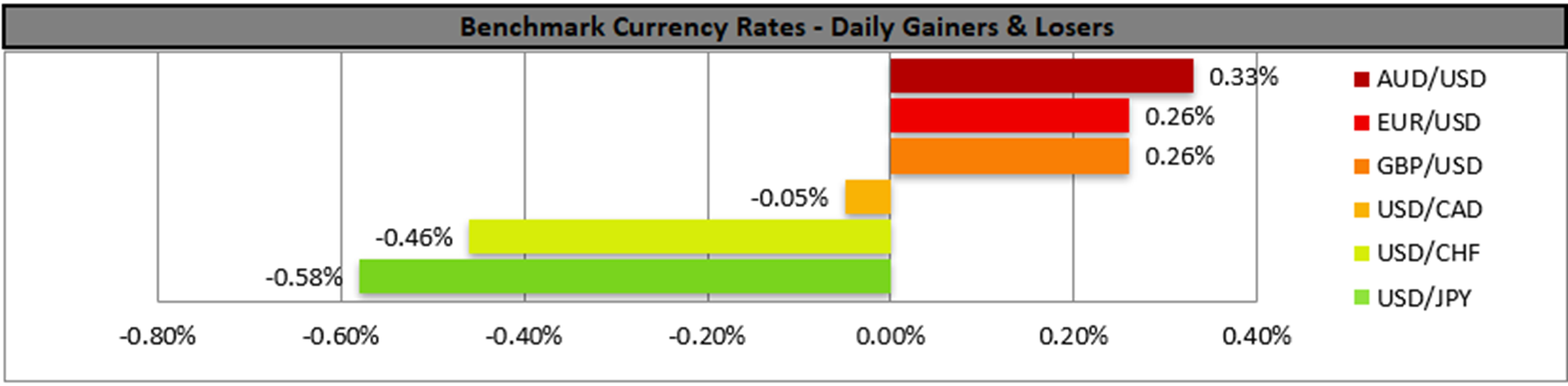 USD/JPY edged lower yesterday remaining well within the boundaries set by the 148.20 (R1) resistance line and the 145.50 (S1) support level. Given that the pair’s price action peaked and corrected lower after testing the upper Bollinger band as mentioned in yesterday’s report and the RSI indicator despite remaining above the reading of 50 has flattened, we tend to maintain a bias for a sideways motion of the pair. Should the bulls regain control we may see USD/JPY breaking the 148.20 (R1) resistance line and open the gates for the 151.20 (R2) resistance base. Should the bears take over, which we currently see as a remote scenario, we may see USD/JPY dropping, breaking the 145.50 (S1) support line and continuing lower to break also the 142.20 (S2) support level, with the next possible target for the bears being the 139.60 (S3) support base.