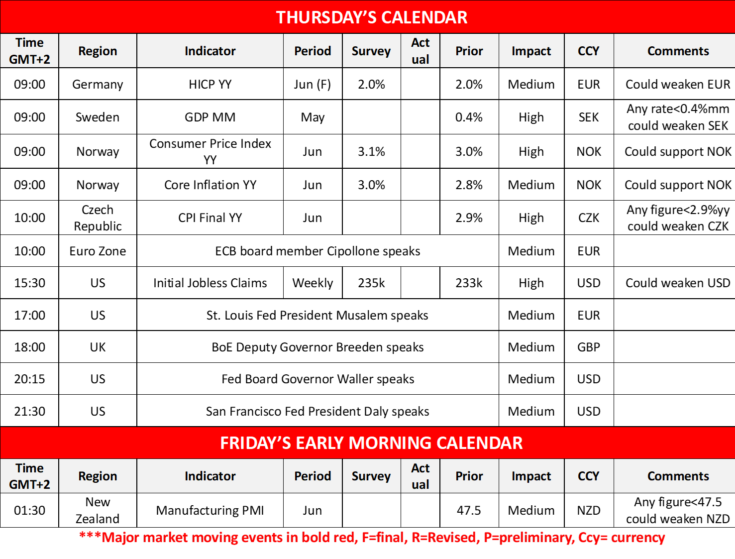 The USD seemed to lose momentum against its counterparts yesterday and it’s expected to be a rather quiet Thursday in regards of financial releases today. Maybe some interest could lie with the release of the weekly US initial jobless claims figure. Other than that, we expect fundamentals to lead the markets today. We make a start with the Fed’s monetary policy intentions and the release of the Fed’s June meeting minutes yesterday. The document showed that Fed policymakers see the case for more rate cuts to come, yet opinions tended to vary in regards to the timing and number of rate cuts. Today we have a number of Fed Policymakers which are scheduled to speak and should we see them underscoring the possibility of more easing to come, we may see the USD slipping and vice versa. On a deeper fundamental level, the markets seem to be less concerned with US President Trump’s tariff intentions than we may have been expecting, yet the issue may continue keeping traders on the edge of their seats. Our interest lies mostly not in the letters already sent out, which have been publicized, but on the tariff letters that are still to be released including Taiwan, India and the EU which have a heavy trading volume with the US. The improved market sentiment allowed for riskier assets to gain some support and its characteristic that Bitcoin neared All Time High levels yesterday. US stock markets gained little support despite the AI frenzy which pushed NVIDIA briefly to a record US$4 trillion market cap. Attention is starting to be placed on the earnings season which is to start next week. Gold’s price benefited only slightly by the weakening of the USD and overall, its movement continues to resemble a sideways motion. On the commodities front, oil prices remained relatively unchanged despite a considerable easing of the US oil market as reported by API and EIA. On the other hand, the rally of US copper prices reaching practically record high levels and fueled by Trump’s tariff intentions seems to continue.