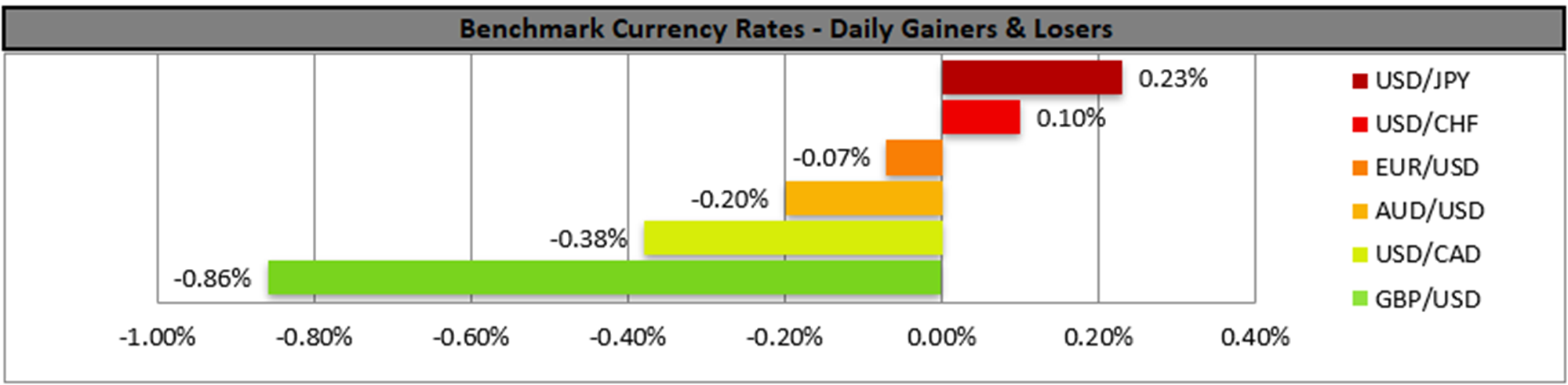 In the FX market, USD/JPY edged higher yesterday remaining well between the 145.50 (R1) resistance line and the 142.20 (S1) support line. Maybe the main characteristic of the pair’s movement yesterday and during today’s Asian session, was the interruption of the downward movement since the 23rd of the month, while the RSI indicator remained below yet close to the reading of 50 implying a relatively weak bearish market sentiment on behalf of the market for the pair. Hence we switch our bearish predisposition in favour of a sideways motion bias. Should the bears regain control over USD/JPY we may see it breaking the 142.20 (S1) support line, thus opening the gates for the 139.60 (S2) support base. Should the bulls take over we may see the pair breaking the 145.50 (R1) line and continues higher aiming for the 148.20 (R2) resistance level.
