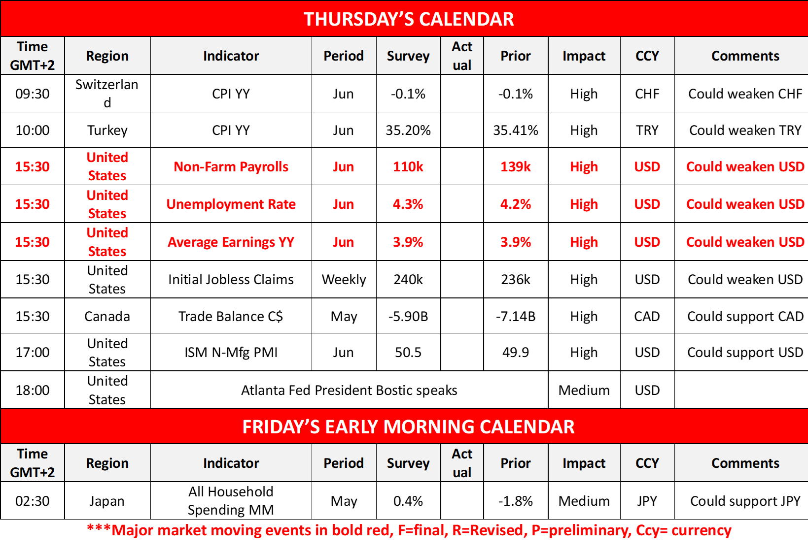 The USD edged higher against its counterparts, yesterday and during today’s Asian session, with the bullish tendencies for the time being unconvincing. On a fundamental level, the USD is set under pressure from the uncertainty created by US President Trump’s tariff wars, market worries for the level of the US national debt, given that Trump’s bill is before the House and finally the market’s dovish expectations for the Fed to cut rates three more times until the end of the year, starting on the September meeting. Today, we highlight US macroeconomics and specifically the release of the US employment report for June. Forecasts are for the Non-Farm Payrolls figure to drop to 110k if compared to May’s 139k, the unemployment rate to tick up reaching 4.3% and the average earnings growth rate to remain unchanged at 3.9%yy. Hence an easing of the US employment market is expected and three scenarios pop out for traders, as the actual rates and figures seldom actually meet the forecasts. The first is for the data to be close to the forecasts, in which case we may see a slight weakening of the USD while in case the data show less easing of the US employment market, could support the USD slightly. The market could be taken by surprise should the data show a beyond forecasts, easing of the US employment market, in which case we expect a substantial weakening of the USD as the market’s expectations for an easing of the Fed’s monetary policy could be enhanced. On the flip side, should the US employment data show a tightening of the US employment market, with the NFP figure rising and the unemployment rate ticking down could provide asymmetric support for the greenback. Yet the release is expected to have ripple effects beyond the FX market, with US equities, gold and to a lesser extent oil, being possible candidates for market movement. A possibly tighter US employment market could weigh on US equities and gold’s price, while a substantially looser US employment market suggesting an easing of the Fed’s monetary policy could support US stock markets and gold’s price.