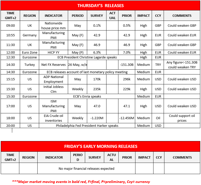 在今天欧洲时段, 我们注意到5月份英国国家房价we note the release of UK’s nationwide house prices for May, 5月份德国和英国制造业PMI 终值, 同月份欧元区HICP 初值率和上周土耳其外汇储备额的发布。在货币方面,欧洲央行主席Christine Lagarde 计划将发言且央行也发布了其最后货币政策会议纪要. 在美国时段, 我们获得了5月份美国ADP 国家就业数据和ISM 制造业 PMI 数据, 以及周初次申领失业救济金人数数据, 而石油交易者可能对周EIA 原油库存数据更感兴趣. 在货币方面,我们注意到欧洲央行Enria 和费城联储主席Harker 计划将发言. 在相当平静的明天亚洲时段, 预计将无主要金融发布