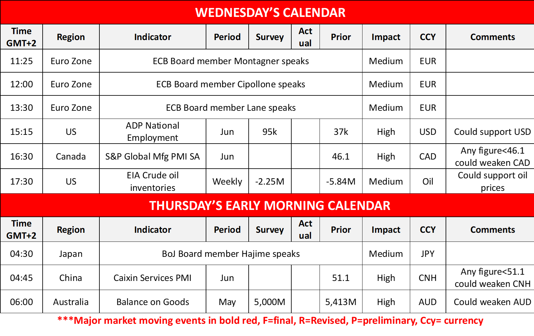 We make a start today with the speeches of ECB’s Montagner, Cipollone and Lane, while later we get the US ADP figure for June, Canada’s manufacturing PMI figure for June and oil traders may be more interested in the release of the weekly US API crude oil inventories figure. In tomorrow’s Asian session, from Japan BoJ’s Hajime speaks, while we note the release of China’s Caixin services PMI figure for June and Australia’s trade data for May.