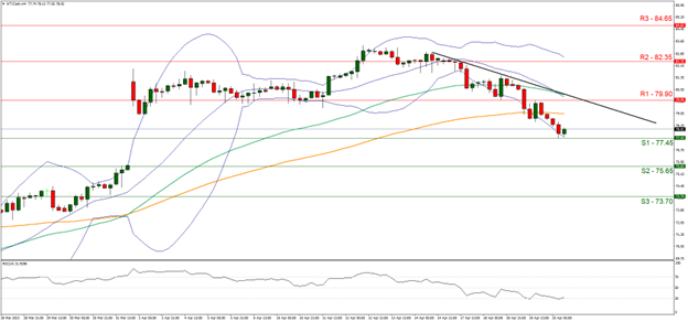 Looking at WTICash 4-hour chart we see crude reversing last week’s gains, having broken below the $80 key psychological level, forming a downwards trendline, and aims for the $77.45 (S1) support line. We hold a bearish outlook bias for the commodity, given its daily downwards path and supporting our case is the RSI indicator below our 4-hour chart which registers a value of 30, showcasing an intense bearish sentiment surrounding WTI. Should the bears extend their dominance, we would like to see a clear break below the $77.45 (S1) support level with a move towards the $75.65 (S2) resistance barrier. Should on the other hand the bulls take over, we may see the break above the descending trendline, the break of the $79.90 (S1) support level and moving towards the $82.35 (S2) support base.